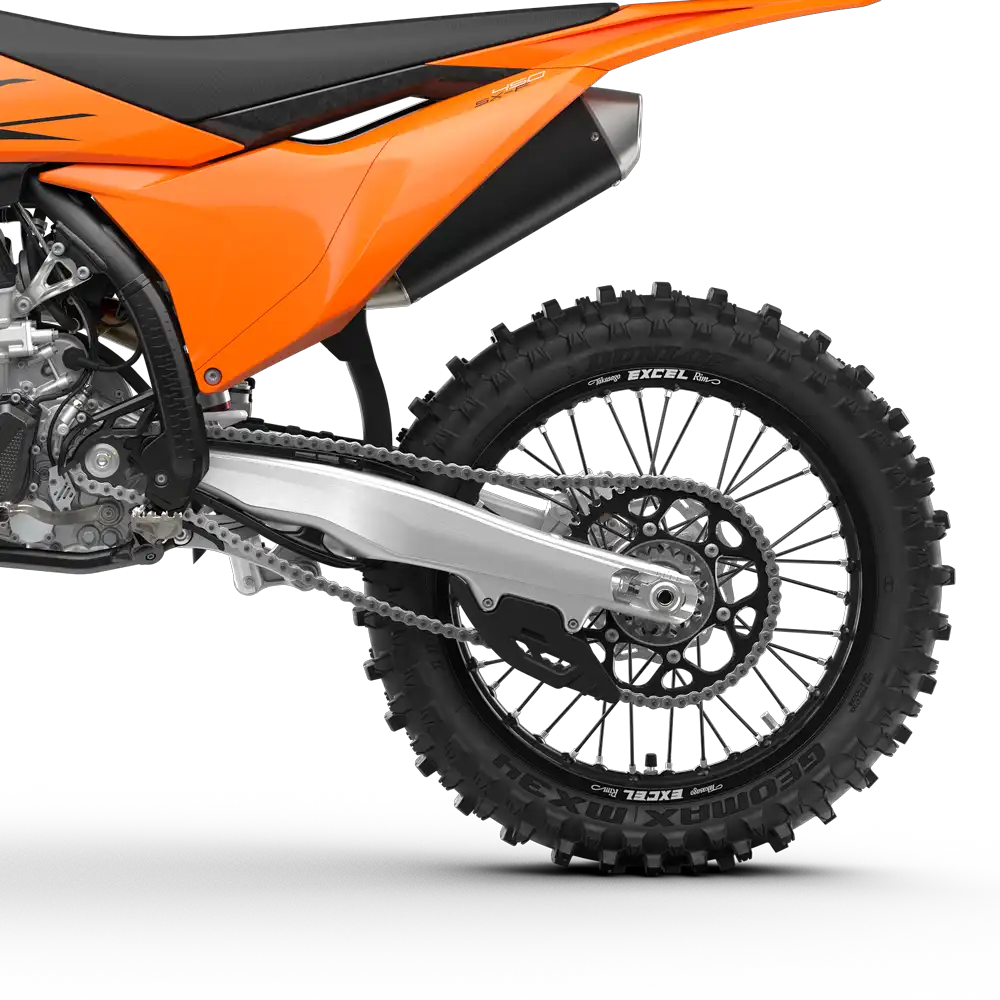 Transmitir la energía a la tierra es un trabajo duro. Sin embargo, horas de investigación y pruebas han llevado a la gama de Motocross de KTM a utilizar los neumáticos Dunlop GEOMAX MX34. Estas gomas, que proporcionan una estabilidad y un control inigualables al más alto nivel, cuentan con una carcasa rígida y un compuesto de caucho que mejora la amortiguación y la absorción, manteniendo el rendimiento hasta un 30% más que las versiones anteriores. La tecnología Progressive Cornering Block también mejora el agarre en las bermas, mientras que el dibujo trasero tiene un bloque central alto y ancho para una tracción y control deseables en cualquier otro lugar. Por último, esta exclusiva disposición de los bloques disipa la acumulación de barro, garantizando la tracción incluso en los circuitos más embarrados.